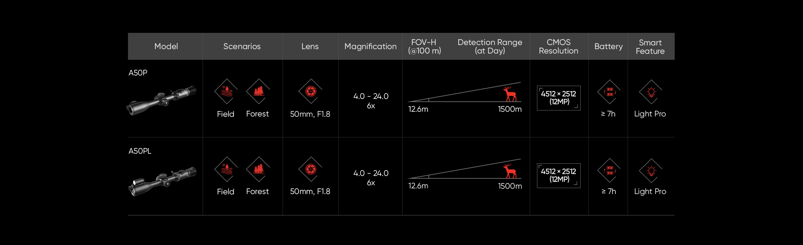 HIKMICRO Alpex PRO A50PL to zaawansowany cyfrowy celownik dzień/noc, zaprojektowany z myślą o myśliwych i strzelcach długodystansowych, którzy oczekują absolutnej kontroli nad sytuacją – od pierwszego światła świtu po najciemniejszą noc. Sercem urządzenia jest 12-megapikselowy sensor CMOS o rozdzielczości 4512×2512 px, który zapewnia niezwykle szczegółowy, kontrastowy obraz i wysoką płynność pracy (do 50 Hz w 12 MP). W praktyce oznacza to szybką identyfikację celu, precyzyjne rozpoznanie detali i pełne zaufanie do sprzętu w dynamicznych warunkach łowieckich.